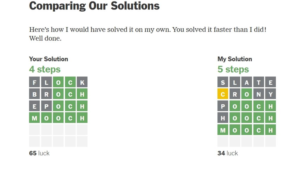 Whatever the game’s charming origins — Wardle invented it out of love — it now functions as a low-frills gift to players, free to use and available to all without ads or distracting pop-up banners. Rabid fans initially had clamored for more than one puzzle per day but those behind Wordle didn’t want an intense relationship. Instead, The New York Times games department settled on airing a single game each day with the unsaid opportunity to brag about one’s better attempts: Got it (the solution) in four tries or better still: “Got It in Three.”